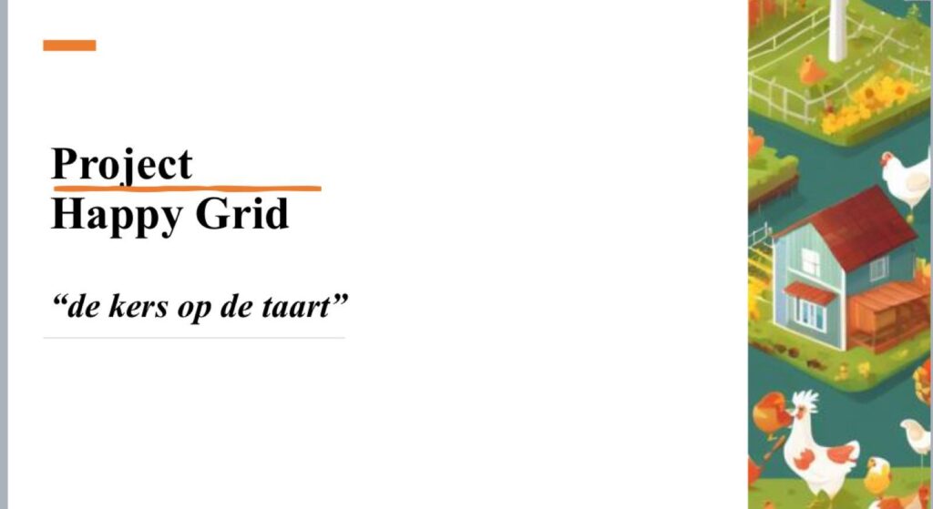 Happy Grid is voor ons als bedrijf en buurt een totaalconcept. Happy Grid is natuurlijk ons eigen Energie Grid: het loskoppelen van de aangesloten huishoudens van het Enexisnet en het aanleggen van een eigen kabelstelsel – 100% op eigen terrein. Maar ‘Grid’ betekent voor ons zoveel meer dan alleen een energiesysteem. De Grid staat ook voor de versterkte band in de buurt, de lijnen in het landschap, de gezamenlijke inspanning rond biodiversiteit, waaronder het gezamenlijke voedselbos en de fauna waar we op inzetten (zowel het welzijn van de kippen van Happy Chicken als nieuwe en al aanwezige diersoorten – egels, vleermuizen, uilen, spreeuwen, zwaluwen, insecten, bijen, enzovoort).